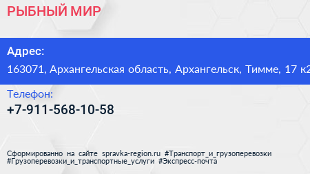 РЫБНЫЙ МИР по адресу 163071, Архангельская область, Архангельск, Тимме, 17 к2 в дальнейшем Организация, размещена в следующих категориях: