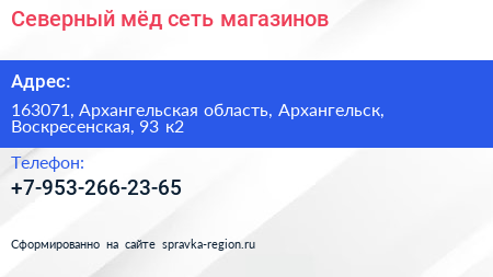 Северный мёд, сеть магазинов по адресу 163071, Архангельская область, Архангельск, Воскресенская, 93 к2 в дальнейшем Организация, размещена в следующих категориях: