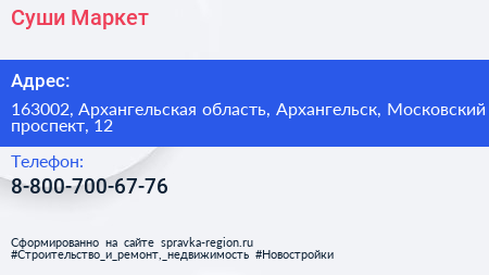 Суши-Маркет по адресу 163002, Архангельская область, Архангельск, Московский проспект, 12 в дальнейшем Организация, размещена в следующих категориях: