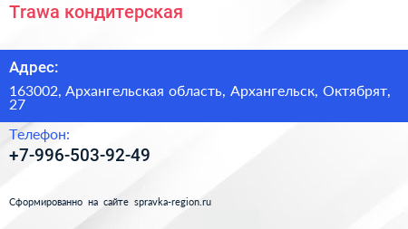 Trawa, кондитерская по адресу 163002, Архангельская область, Архангельск, Октябрят, 27 в дальнейшем Организация, размещена в следующих категориях: