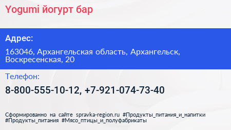 Yogumi, йогурт-бар по адресу 163046, Архангельская область, Архангельск, Воскресенская, 20 в дальнейшем Организация, размещена в следующих категориях: