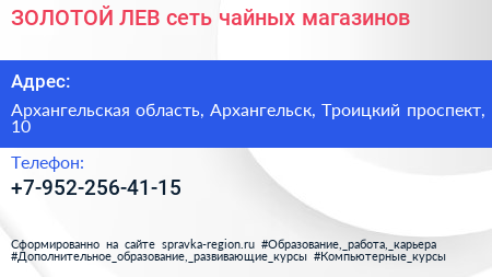 ЗОЛОТОЙ ЛЕВ, сеть чайных магазинов по адресу Архангельская область, Архангельск, Троицкий проспект, 10 в дальнейшем Организация, размещена в следующих категориях: