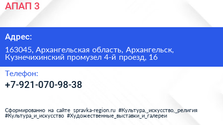 АПАП-3 по адресу 163045, Архангельская область, Архангельск, Кузнечихинский промузел 4-й проезд, 16 в дальнейшем Организация, размещена в следующих категориях: