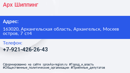 Арх-Шиппинг по адресу 163020, Архангельская область, Архангельск, Мосеев остров, 7 ст4 в дальнейшем Организация, размещена в следующих категориях:
