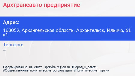 Архтрансавто, предприятие по адресу 163059, Архангельская область, Архангельск, Ильича, 61 к1 в дальнейшем Организация, размещена в следующих категориях: