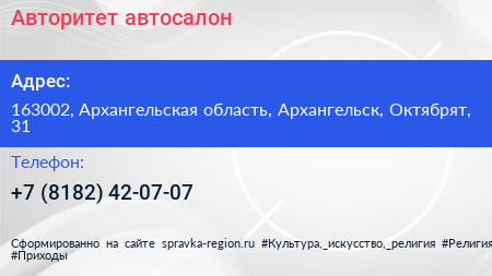 Авторитет, автосалон по адресу 163002, Архангельская область, Архангельск, Октябрят, 31 в дальнейшем Организация, размещена в следующих категориях: