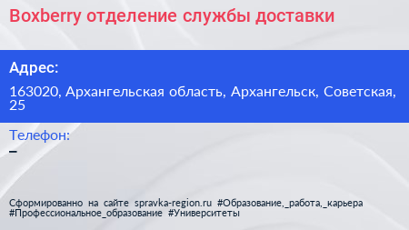 Boxberry, отделение службы доставки по адресу 163020, Архангельская область, Архангельск, Советская, 25 в дальнейшем Организация, размещена в следующих категориях: