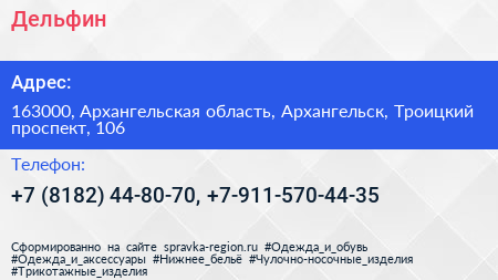 Дельфин по адресу 163000, Архангельская область, Архангельск, Троицкий проспект, 106 в дальнейшем Организация, размещена в следующих категориях:
