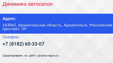 Динамика, автосалон по адресу 163065, Архангельская область, Архангельск, Московский проспект, 39 в дальнейшем Организация, размещена в следующих категориях: