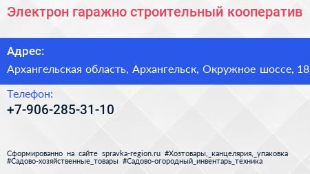 Электрон, гаражно-строительный кооператив по адресу Архангельская область, Архангельск, Окружное шоссе, 18 в дальнейшем Организация, размещена в следующих категориях: