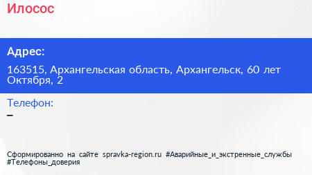 Илосос по адресу 163515, Архангельская область, Архангельск, 60 лет Октября, 2 в дальнейшем Организация, размещена в следующих категориях:
