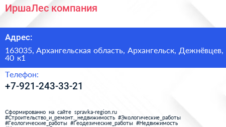 ИршаЛес, компания по адресу 163035, Архангельская область, Архангельск, Дежнёвцев, 40 к1 в дальнейшем Организация, размещена в следующих категориях: