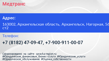 Медтранс по адресу 163002, Архангельская область, Архангельск, Нагорная, 56 ст2 в дальнейшем Организация, размещена в следующих категориях: