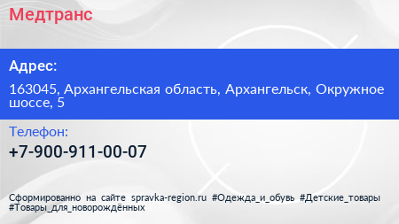 Медтранс по адресу 163045, Архангельская область, Архангельск, Окружное шоссе, 5 в дальнейшем Организация, размещена в следующих категориях: