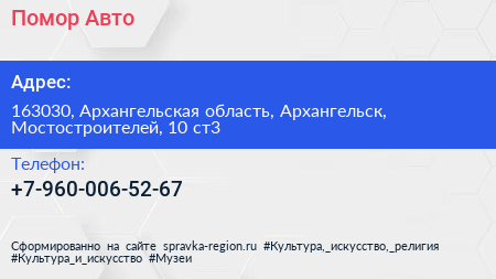 Помор Авто по адресу 163030, Архангельская область, Архангельск, Мостостроителей, 10 ст3 в дальнейшем Организация, размещена в следующих категориях: