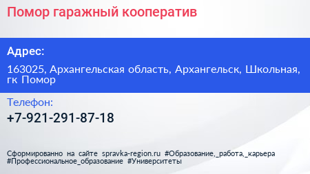 Помор, гаражный кооператив по адресу 163025, Архангельская область, Архангельск, Школьная, гк Помор в дальнейшем Организация, размещена в следующих категориях: