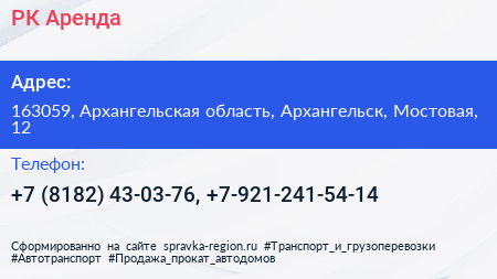 РК Аренда по адресу 163059, Архангельская область, Архангельск, Мостовая, 12 в дальнейшем Организация, размещена в следующих категориях: