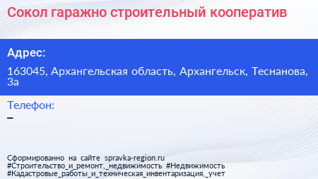 Сокол, гаражно-строительный кооператив по адресу 163045, Архангельская область, Архангельск, Теснанова, 3а в дальнейшем Организация, размещена в следующих категориях: