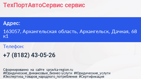 ТехПортАвтоСервис, сервис по адресу 163057, Архангельская область, Архангельск, Дачная, 68 к1 в дальнейшем Организация, размещена в следующих категориях: