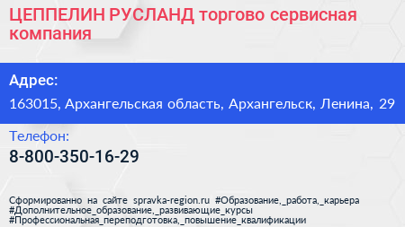 ЦЕППЕЛИН РУСЛАНД, торгово-сервисная компания по адресу 163015, Архангельская область, Архангельск, Ленина, 29 в дальнейшем Организация, размещена в следующих категориях: