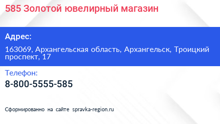 585 Золотой, ювелирный магазин по адресу 163069, Архангельская область, Архангельск, Троицкий проспект, 17 в дальнейшем Организация, размещена в следующих категориях: