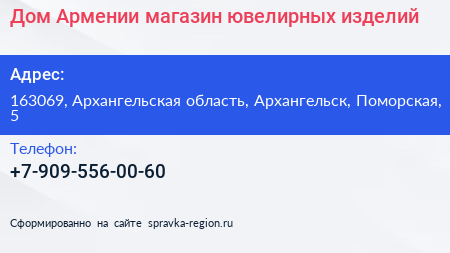 Дом Армении, магазин ювелирных изделий по адресу 163069, Архангельская область, Архангельск, Поморская, 5 в дальнейшем Организация, размещена в следующих категориях: