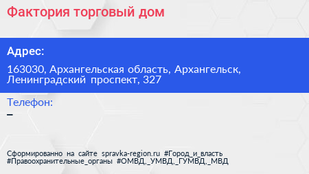 Фактория, торговый дом по адресу 163030, Архангельская область, Архангельск, Ленинградский проспект, 327 в дальнейшем Организация, размещена в следующих категориях: