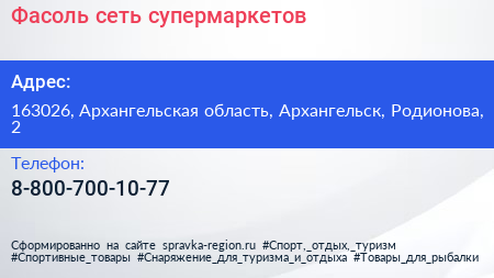 Фасоль, сеть супермаркетов по адресу 163026, Архангельская область, Архангельск, Родионова, 2 в дальнейшем Организация, размещена в следующих категориях: