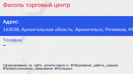 Фасоль, торговый центр по адресу 163038, Архангельская область, Архангельск, Речников, 49 в дальнейшем Организация, размещена в следующих категориях: