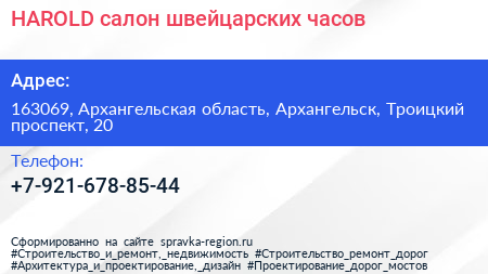 HAROLD, салон швейцарских часов по адресу 163069, Архангельская область, Архангельск, Троицкий проспект, 20 в дальнейшем Организация, размещена в следующих категориях:
