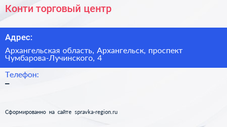 Конти, торговый центр по адресу Архангельская область, Архангельск, проспект Чумбарова-Лучинского, 4 в дальнейшем Организация, размещена в следующих категориях: