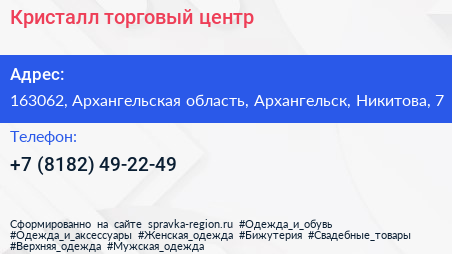 Кристалл, торговый центр по адресу 163062, Архангельская область, Архангельск, Никитова, 7 в дальнейшем Организация, размещена в следующих категориях: