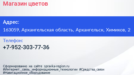Магазин цветов по адресу 163059, Архангельская область, Архангельск, Химиков, 2 в дальнейшем Организация, размещена в следующих категориях: