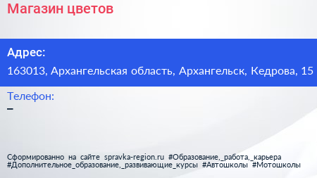 Магазин цветов по адресу 163013, Архангельская область, Архангельск, Кедрова, 15 в дальнейшем Организация, размещена в следующих категориях: