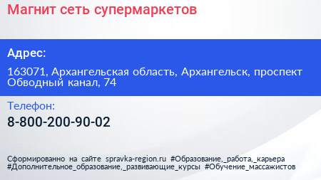 Магнит, сеть супермаркетов по адресу 163071, Архангельская область, Архангельск, проспект Обводный канал, 74 в дальнейшем Организация, размещена в следующих категориях: