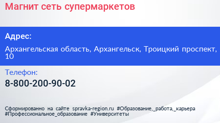 Магнит, сеть супермаркетов по адресу Архангельская область, Архангельск, Троицкий проспект, 10 в дальнейшем Организация, размещена в следующих категориях: