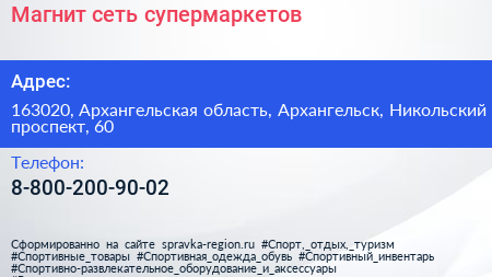 Магнит, сеть супермаркетов по адресу 163020, Архангельская область, Архангельск, Никольский проспект, 60 в дальнейшем Организация, размещена в следующих категориях: