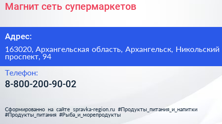 Магнит, сеть супермаркетов по адресу 163020, Архангельская область, Архангельск, Никольский проспект, 94 в дальнейшем Организация, размещена в следующих категориях: