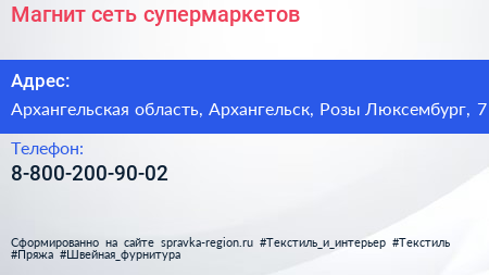 Магнит, сеть супермаркетов по адресу Архангельская область, Архангельск, Розы Люксембург, 7 в дальнейшем Организация, размещена в следующих категориях: