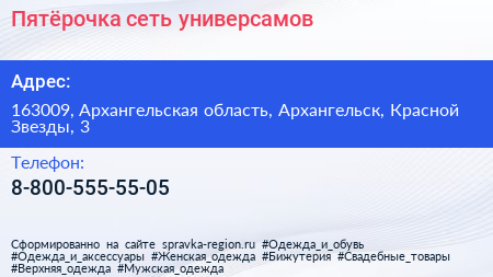 Пятёрочка, сеть универсамов по адресу 163009, Архангельская область, Архангельск, Красной Звезды, 3 в дальнейшем Организация, размещена в следующих категориях: