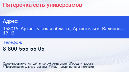 Пятёрочка, сеть универсамов по адресу 163015, Архангельская область, Архангельск, Калинина, 19 к2 в дальнейшем Организация, размещена в следующих категориях: