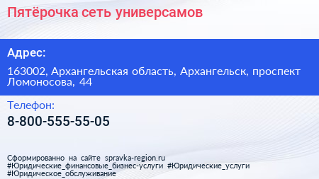 Пятёрочка, сеть универсамов по адресу 163002, Архангельская область, Архангельск, проспект Ломоносова, 44 в дальнейшем Организация, размещена в следующих категориях: