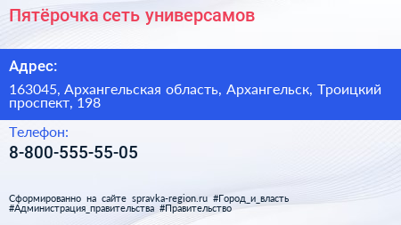 Пятёрочка, сеть универсамов по адресу 163045, Архангельская область, Архангельск, Троицкий проспект, 198 в дальнейшем Организация, размещена в следующих категориях: