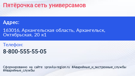 Пятёрочка, сеть универсамов по адресу 163016, Архангельская область, Архангельск, Октябрьская, 20 к1 в дальнейшем Организация, размещена в следующих категориях: