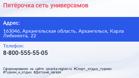 Пятёрочка, сеть универсамов по адресу 163046, Архангельская область, Архангельск, Карла Либкнехта, 22 в дальнейшем Организация, размещена в следующих категориях: