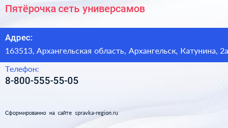 Пятёрочка, сеть универсамов по адресу 163513, Архангельская область, Архангельск, Катунина, 2а в дальнейшем Организация, размещена в следующих категориях: