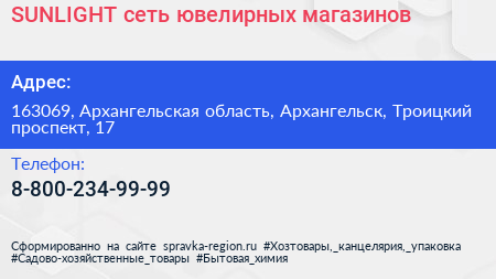 SUNLIGHT, сеть ювелирных магазинов по адресу 163069, Архангельская область, Архангельск, Троицкий проспект, 17 в дальнейшем Организация, размещена в следующих категориях: