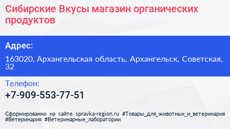 Сибирские Вкусы, магазин органических продуктов по адресу 163020, Архангельская область, Архангельск, Советская, 32 в дальнейшем Организация, размещена в следующих категориях: