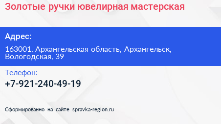 Золотые ручки, ювелирная мастерская по адресу 163001, Архангельская область, Архангельск, Вологодская, 39 в дальнейшем Организация, размещена в следующих категориях: