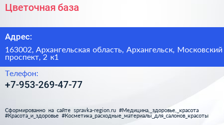 Цветочная база по адресу 163002, Архангельская область, Архангельск, Московский проспект, 2 к1 в дальнейшем Организация, размещена в следующих категориях: